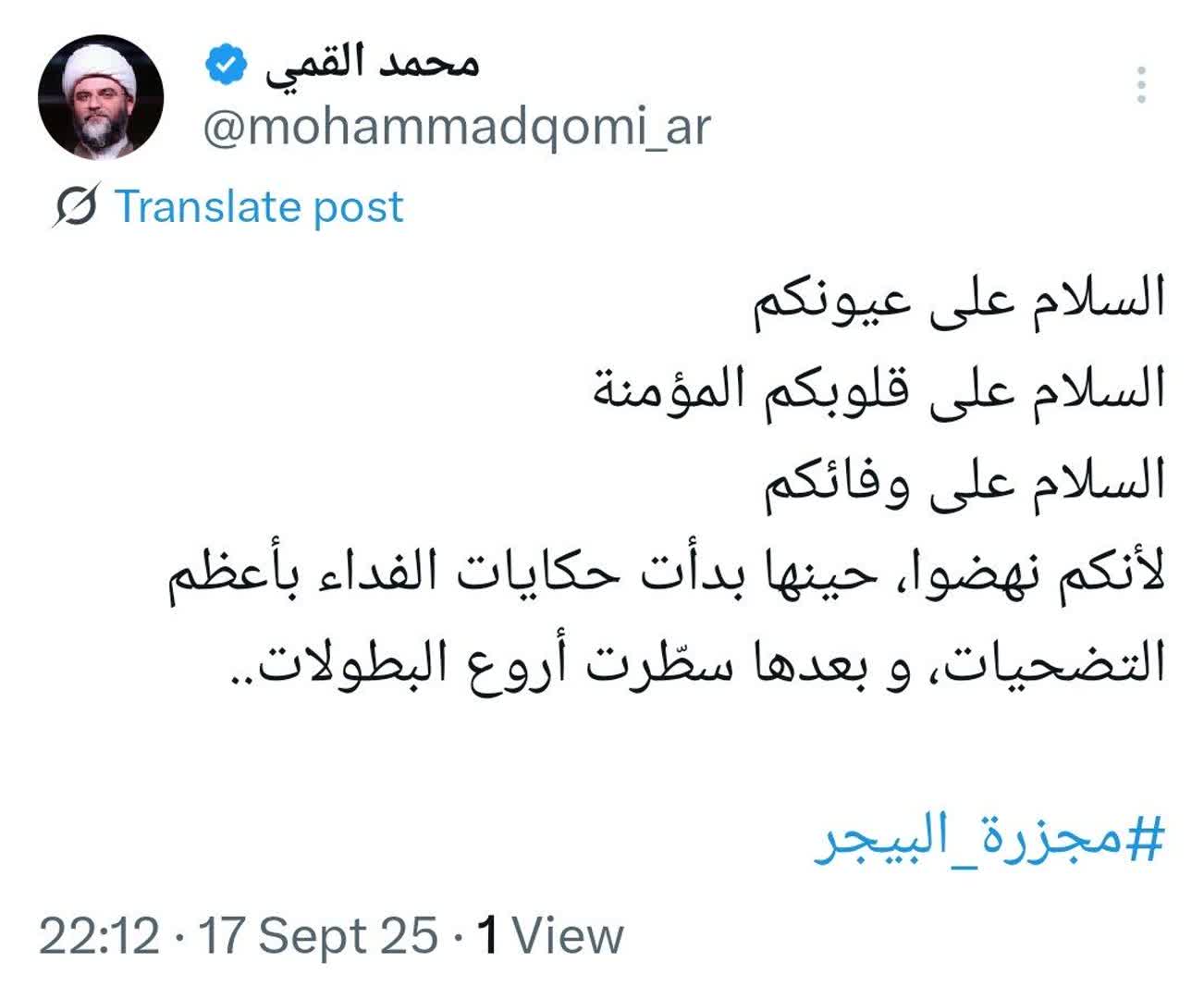 به گزارش روابط عمومی سازمان تبلیغات اسلامی، حجت‌الاسلام محمد قمی، رئیس سازمان تبلیغات اسلامی در صفحه شخصی خود در شبکه اجتماعی ایکس ویژه کاربران عرب زبان در سالگرد حادثه انفجار پیچرها در لبنان نوشت؛