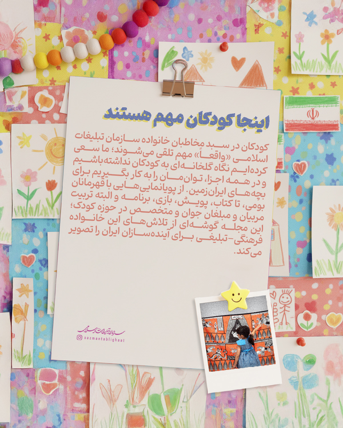 کودکان در سبد مخاطبان خانواده سازمان تبلیغات اسلامی «واقعاً» مهم تلقی میشوند؛ ما سعی کردهایم نگاه گلخانهای به کودکان نداشتهباشیم و در همه اجزا، توانمان را به کار بگیریم برای بچههای ایرانزمین. از پویانماییهایی با قهرمانان بومی، تا کتاب، پویش، بازی، برنامه و البته تربیت مربیان و مبلغان جوان و متخصص در حوزه کودک؛ این مجله گوشهای از تلاشهای این خانواده فرهنگی-تبلیغی برای آیندهسازان ایران را تصویر میکند.