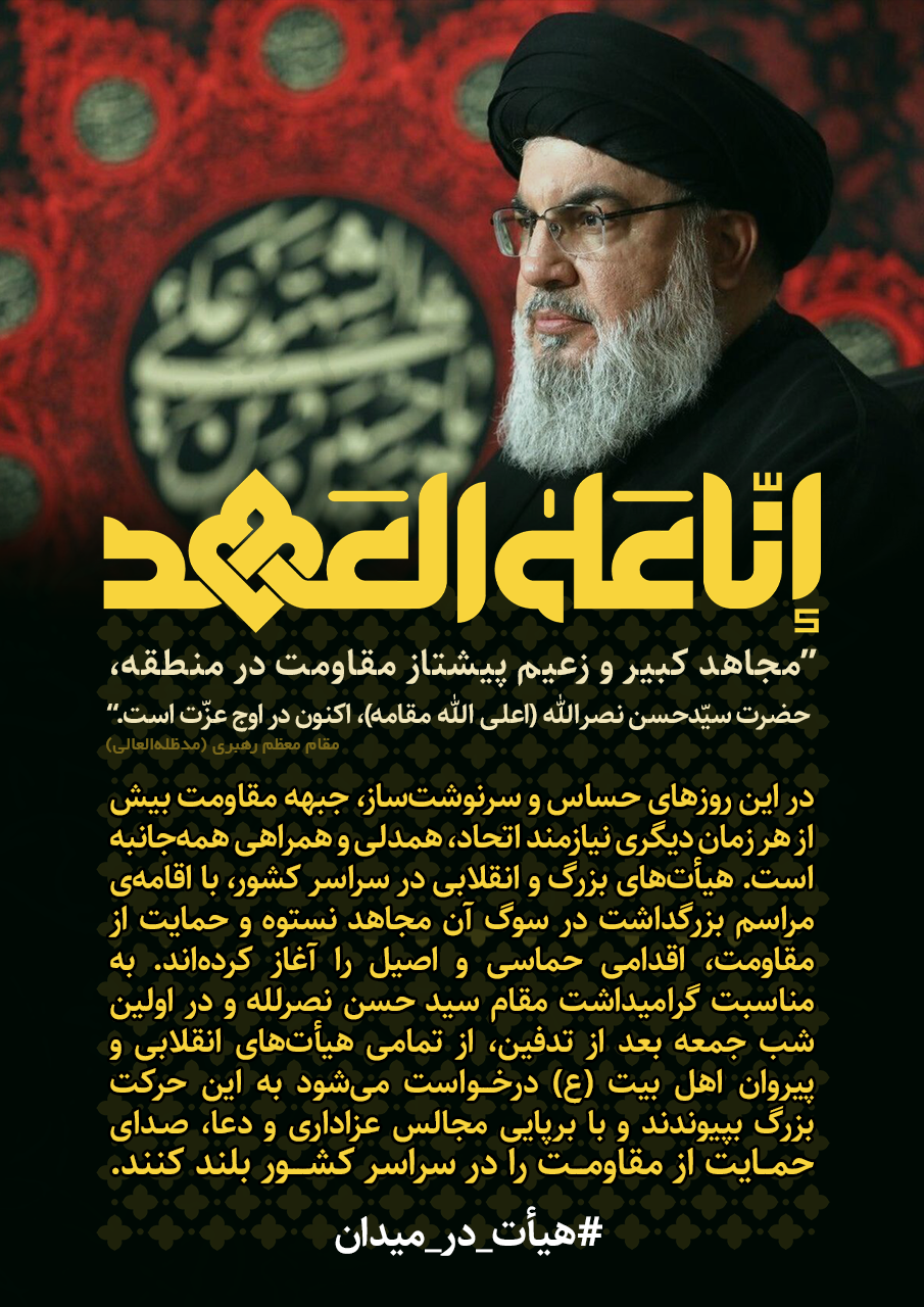 پیرو پیام مقام معظم رهبری (مدظلهالعالی) در مراسم تدفین سید حسن نصرالله که فرمودند: «مجاهد کبیر و زعیم پیشتاز مقاومت در منطقه، حضرت سیّدحسن نصرالله (اعلی الله مقامه)، اکنون در اوج عزّت است.»؛ در این روزهای حساس و سرنوشتساز، جبهه مقاومت بیش از هر زمان دیگری نیازمند اتحاد، همدلی و همراهی همهجانبه است. هیأتهای بزرگ و انقلابی در سراسر کشور، با اقامهی مراسم بزرگداشت در سوگ آن مجاهد نستوه، و حمایت از مقاومت، اقدامی حماسی و اصیل را آغاز کردهاند.