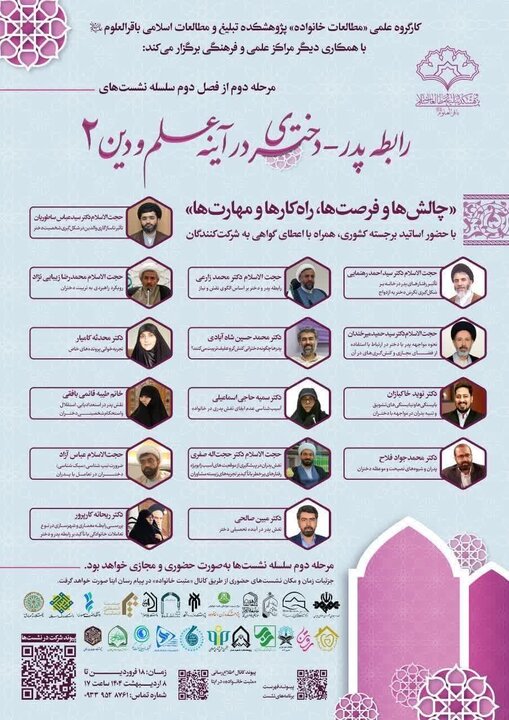 کارگروه علمی مطالعات خانواده پژوهشکده تبلیغ و مطالعات اسلامی باقرالعلوم (علیهالسلام) با همکاری مراکز علمی و فرهنگی، مرحله دوم از فصل دوم سلسله نشستهای علمی «رابطه پدر_دختری در آینه علم و دین» را با عنوان «چالشها و فرصتها، راهکارها و مهارتها» به صورت حضوری و مجازی برگزار میکند.