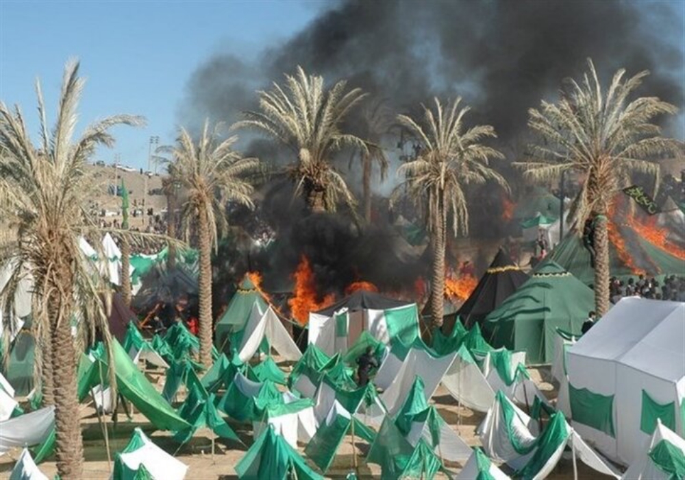 این خیمهها از نذورات مردمی هستند که هر کدام به نیتی خاص برپا و مراسم نوحهسرایی، قرائت زیارت عاشورا، سینه زنی و زنجیرزنی در این خیمهها برگزار میشود. پس از سوختن خیمهها طی آیینی خاص و اجرای برنامههای متعدد، حرکت هیئتهای عزاداری به سوی بقعه امامزاده شیخ زین الدین (ع) که در تپه مشرف به زمین محل خیمه گاه قرار دارد ادامه یافته و سپس نماز ظهر عاشورا در مجاورت بقعه متبرکه این امامزاده (ع) و گلزار شهدا اقامه میشود.